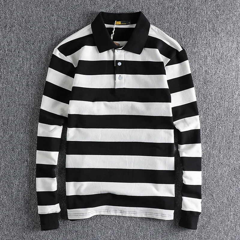 Retro Striped Washed Terry Casual Lapel Long-Sleeved Polo Shirt